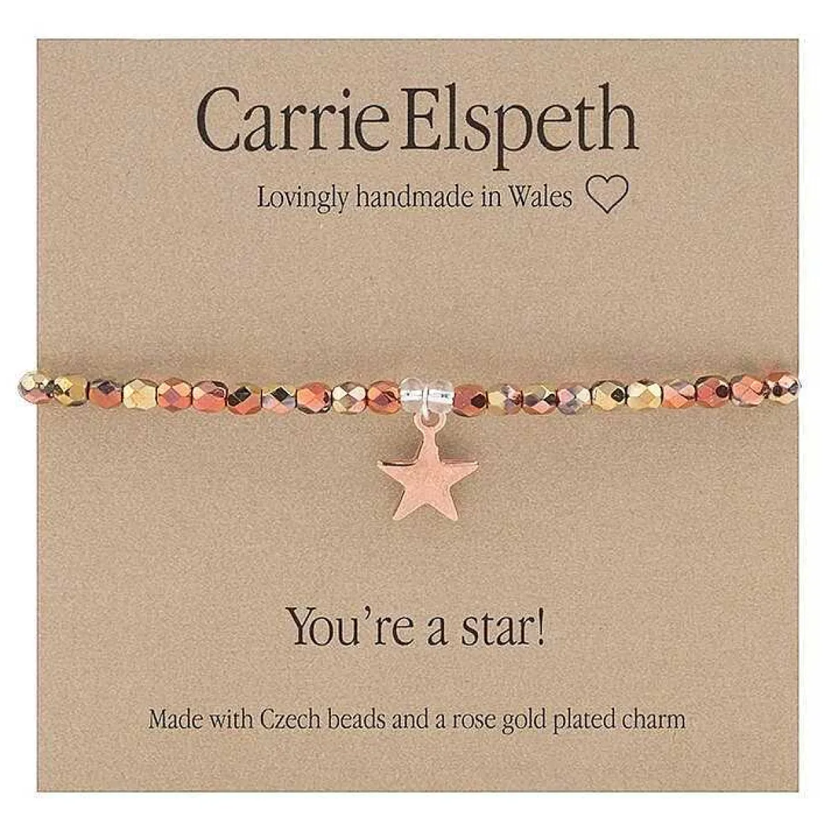Send A Special Message With This Beautiful Bracelet From Carrie Elspeth. The Bracelet Features Copper And Gold Czech Beads And A Cute Rose Gold Plated Star Pendant Attached Between Two Clear Beads. The Bracelet Stretches To Fit Over Your Wrist, Meaning You Can Easily Take It On And Off To Accessorise Your Outfit.